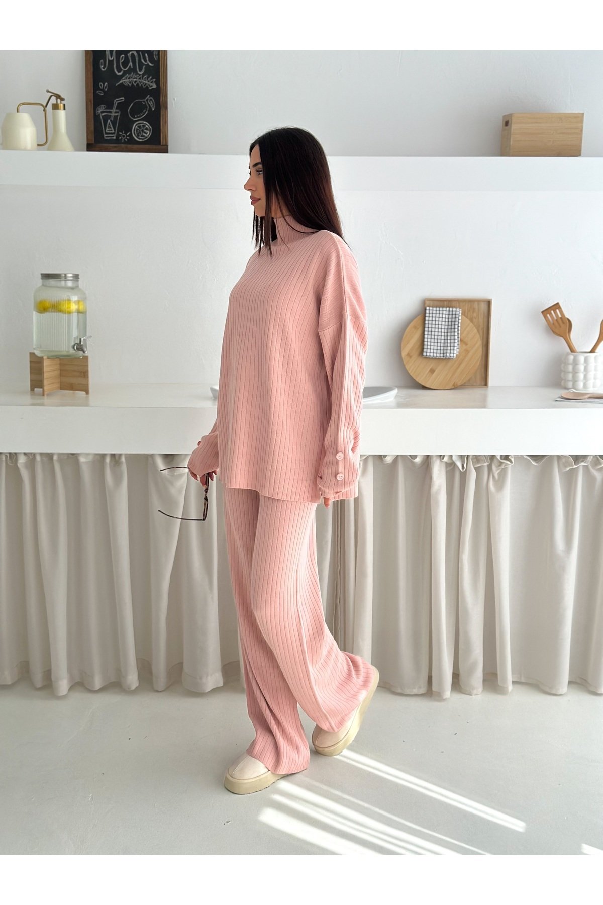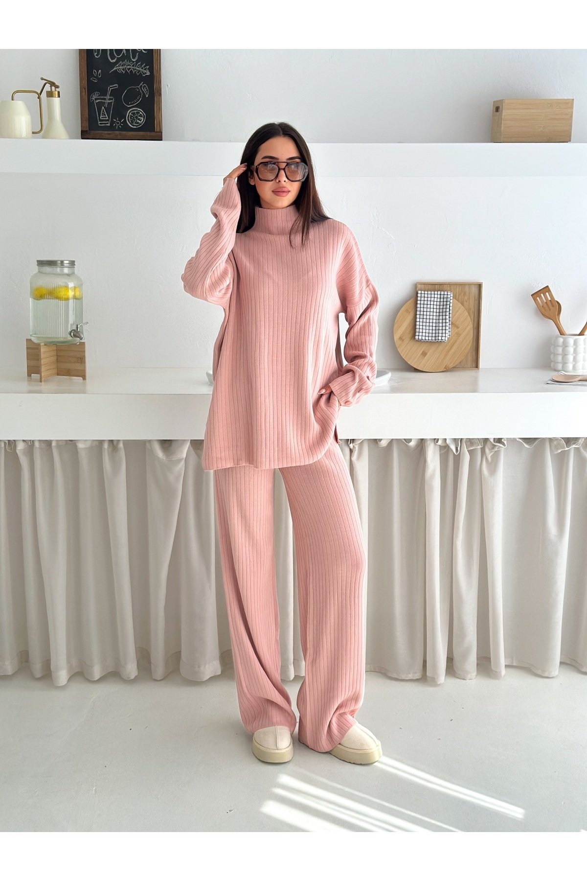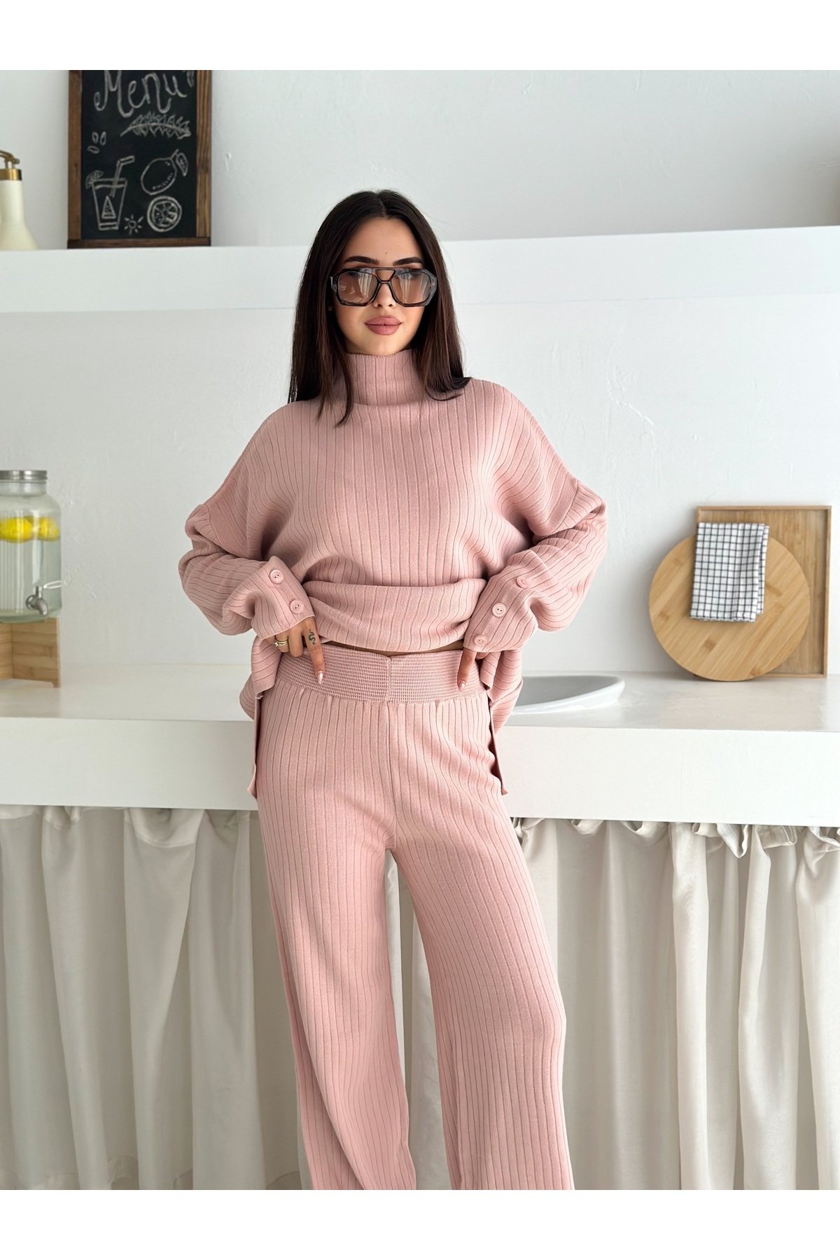 - Balıkçı yaka tasarımı ile hem şıklığı hem de rahatlığı bir arada sunar.; - Orta kalınlıkta triko kumaşı, mevsim geçişlerinde ideal konfor sağlar.; - Cool & comfort persona'sına uygun olarak tasarlanmıştır; günlük kullanım için uygundur.; - Basic koleksiyonun sadeliğini yansıtan bu takım, her gardıropta temel parça olmaya adaydır.; - Mono kapama detayı ile modern ve zarif bir görünüm kazandırır.; - Yüksek bel kesimi sayesinde vücut hatlarını nazikçe sararak feminen bir siluet oluşturur.; - İki parçadan oluşan set, pratik kombin seçenekleri sunar.; - Sürdürülebilirlik detayının bulunmaması, ürünün çevreye duyarlılık açısından sınırları olduğunu gösterir.; - Baskısız deseniyle sade ve zamansız bir tarza sahiptir; farklı aksesuarlarla kolayca kişiselleştirilebilir.; - Geniş paça pantolonuyla rahat hareket etme özgürlüğü tanırken şık duruşunu korur.; - Kutu olmadan gönderilen paketiyle minimalist yaklaşımı benimserken ekstra maliyetten tasarruf edilmesini sağlar.; - Astarsız yapısıyla hafifliği ön planda tutarken cilt dostu dokusuyla gün boyu konfor sunar.; - Cepsiz tasarım, minimalist estetiğe katkıda bulunarak minimalist zevklere hitap eder.; - Yıkama talimatlarına uyulduğunda uzun süre ilk günkü gibi kalmasını garanti eder.; - Düz renk seçeneğiyle kolayca diğer giysilerle eşleştirilebilir; çok yönlülük katmak isteyenlere idealdir.; - %60 akrilik ve %40 pamuk karışımından oluşan materyali yumuşak dokusuyla teninizde hoş hissettirir.; - Kemersiz yapısıyla minimalizmi destekleyerek basit ama etkili bir stil ortaya koyma imkanı verir.; - Fitilli dokuması sayesinde dayanıklılığı arttırarak ürün ömrünü uzatır.; -Esnek yapıya sahip olması hareket serbestisi sağlayarak gün içindeki aktivitelere uyum gösterir.; -Düz deseniyle kolayca kombinlenebilir; farklı aksesuarlarla kişisel tarzınızı yansıtma fırsatını sunar.; - Regular kalıp ile vücudu saran ancak sıkmayan ideal oturuşa sahiptir; her bedene uygunluk gösterir.; -Kadın/kız cinsiyetine hitap eden bu takım, casual/günlük ortamlarda rahatlıkla tercih edilebilir.; -Kazak-pantolon alt üst takımı olarak tasarlanmış olup evden işe her yerde şıklığınızdan ödün vermeden kullanabilirsiniz.