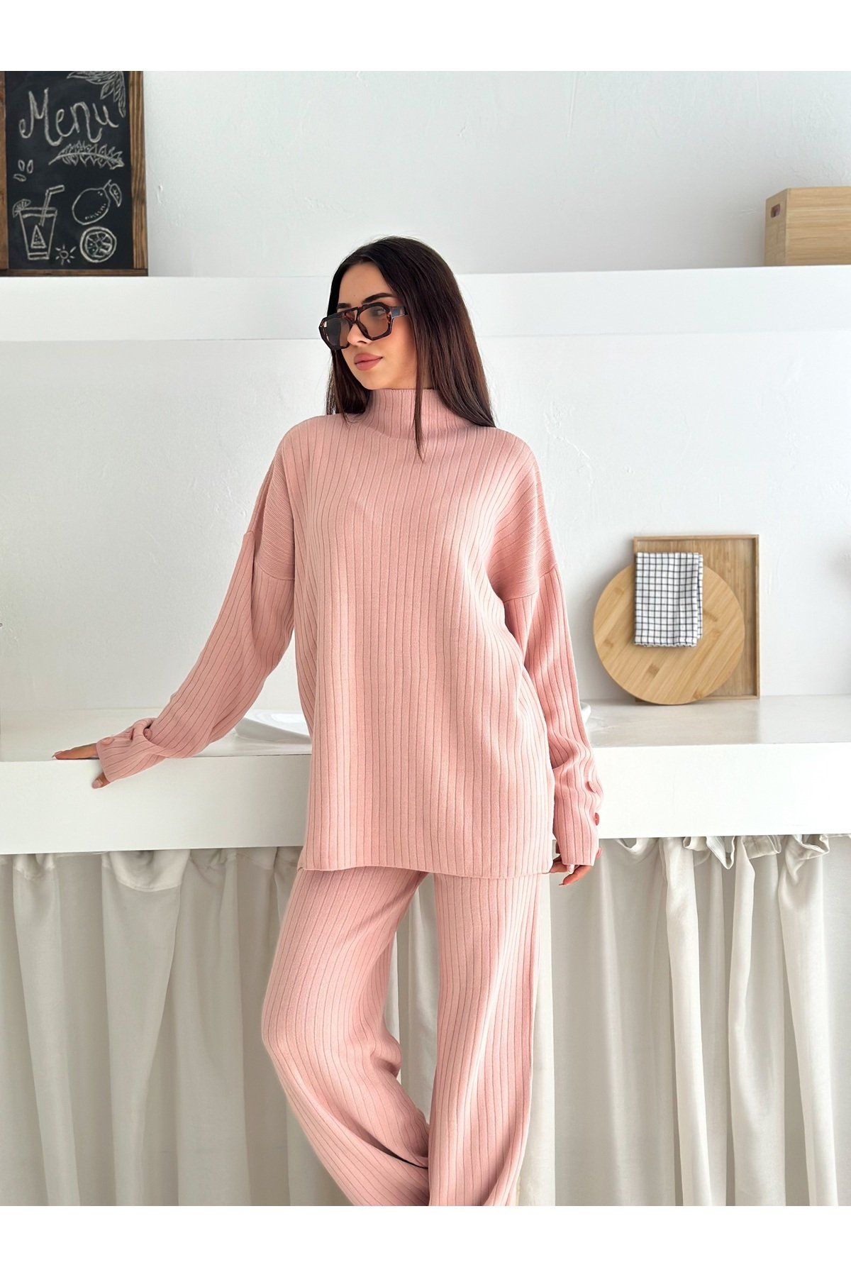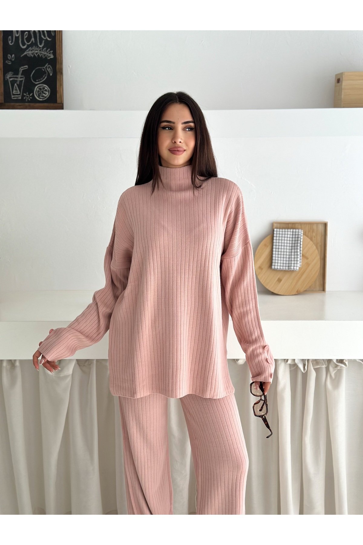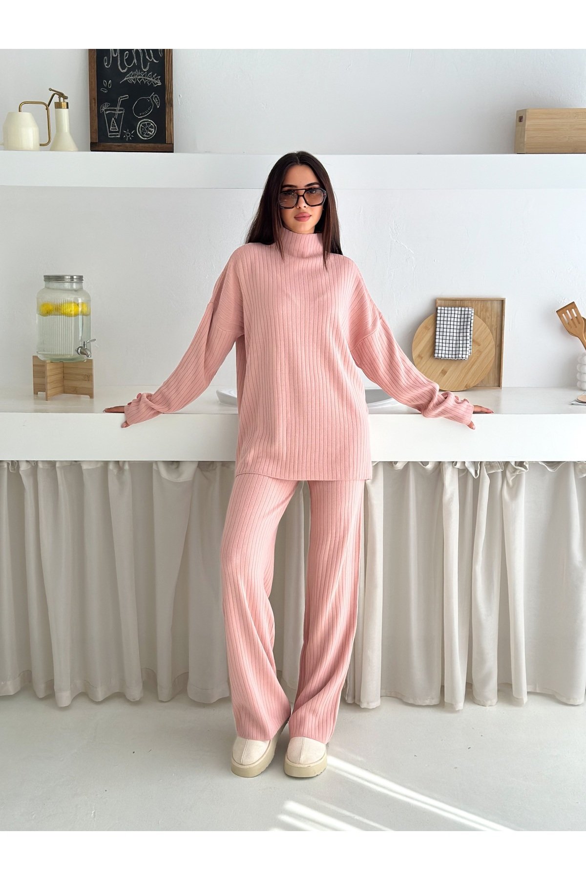 - Balıkçı yaka tasarımı ile hem şıklığı hem de rahatlığı bir arada sunar.; - Orta kalınlıkta triko kumaşı, mevsim geçişlerinde ideal konfor sağlar.; - Cool & comfort persona'sına uygun olarak tasarlanmıştır; günlük kullanım için uygundur.; - Basic koleksiyonun sadeliğini yansıtan bu takım, her gardıropta temel parça olmaya adaydır.; - Mono kapama detayı ile modern ve zarif bir görünüm kazandırır.; - Yüksek bel kesimi sayesinde vücut hatlarını nazikçe sararak feminen bir siluet oluşturur.; - İki parçadan oluşan set, pratik kombin seçenekleri sunar.; - Sürdürülebilirlik detayının bulunmaması, ürünün çevreye duyarlılık açısından sınırları olduğunu gösterir.; - Baskısız deseniyle sade ve zamansız bir tarza sahiptir; farklı aksesuarlarla kolayca kişiselleştirilebilir.; - Geniş paça pantolonuyla rahat hareket etme özgürlüğü tanırken şık duruşunu korur.; - Kutu olmadan gönderilen paketiyle minimalist yaklaşımı benimserken ekstra maliyetten tasarruf edilmesini sağlar.; - Astarsız yapısıyla hafifliği ön planda tutarken cilt dostu dokusuyla gün boyu konfor sunar.; - Cepsiz tasarım, minimalist estetiğe katkıda bulunarak minimalist zevklere hitap eder.; - Yıkama talimatlarına uyulduğunda uzun süre ilk günkü gibi kalmasını garanti eder.; - Düz renk seçeneğiyle kolayca diğer giysilerle eşleştirilebilir; çok yönlülük katmak isteyenlere idealdir.; - %60 akrilik ve %40 pamuk karışımından oluşan materyali yumuşak dokusuyla teninizde hoş hissettirir.; - Kemersiz yapısıyla minimalizmi destekleyerek basit ama etkili bir stil ortaya koyma imkanı verir.; - Fitilli dokuması sayesinde dayanıklılığı arttırarak ürün ömrünü uzatır.; -Esnek yapıya sahip olması hareket serbestisi sağlayarak gün içindeki aktivitelere uyum gösterir.; -Düz deseniyle kolayca kombinlenebilir; farklı aksesuarlarla kişisel tarzınızı yansıtma fırsatını sunar.; - Regular kalıp ile vücudu saran ancak sıkmayan ideal oturuşa sahiptir; her bedene uygunluk gösterir.; -Kadın/kız cinsiyetine hitap eden bu takım, casual/günlük ortamlarda rahatlıkla tercih edilebilir.; -Kazak-pantolon alt üst takımı olarak tasarlanmış olup evden işe her yerde şıklığınızdan ödün vermeden kullanabilirsiniz.