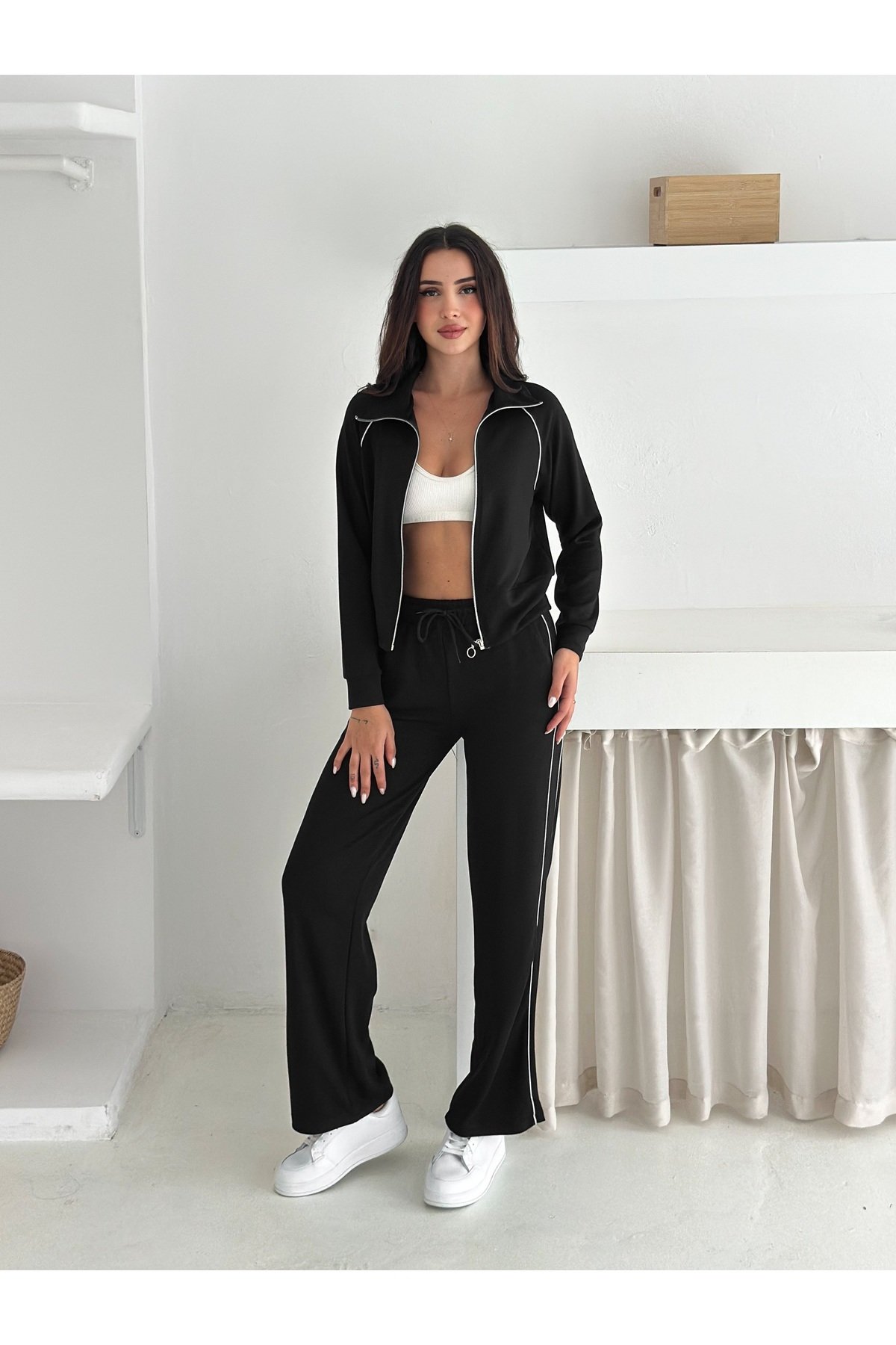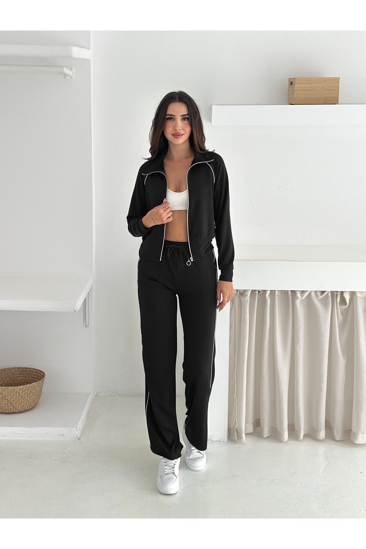 - Uzun paça tasarımı ile modern ve şık bir görünüm sunar.; - Polyester karışımlı materyali sayesinde dayanıklılık ve konforu bir arada yaşatır.; - Esnek yapısı ile hareket özgürlüğünüzü kısıtlamaz, gün boyu rahatlık sağlar.; - Uzun kollu tasarımı, mevsim geçişlerinde ideal koruma sunar.; - Çizgili deseniyle zamansız bir stil oluşturur ve farklı kombinlerle kolayca uyum sağlar.; - Boru paça kesimi, klasik eşofmanlara modern bir dokunuş ekler.; - Fermuarlı yaka detayı ile pratik kullanım imkanı tanır; soğuk havalarda ekstra koruma sağlar.; - Casual ortamlar için ideal olan bu takım, günlük kullanımda rahatlığı ve stili bir arada sunar.; - Basic koleksiyonun parçası olarak, gardırobunuzda temel bir parça olarak yerini alır.; - Türkiye'de üretilmiş olup, yerel üretimden desteklenerek sürdürülebilir moda anlayışına katkıda bulunur.;