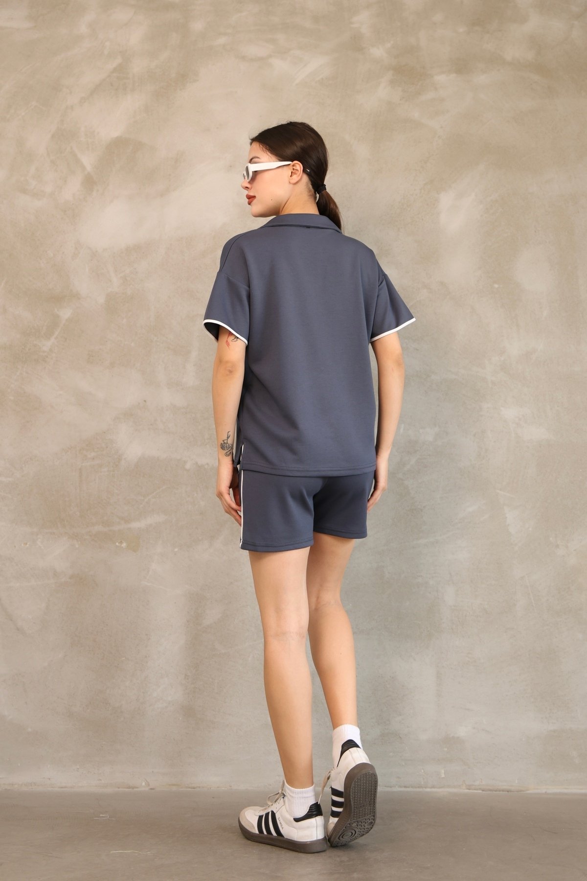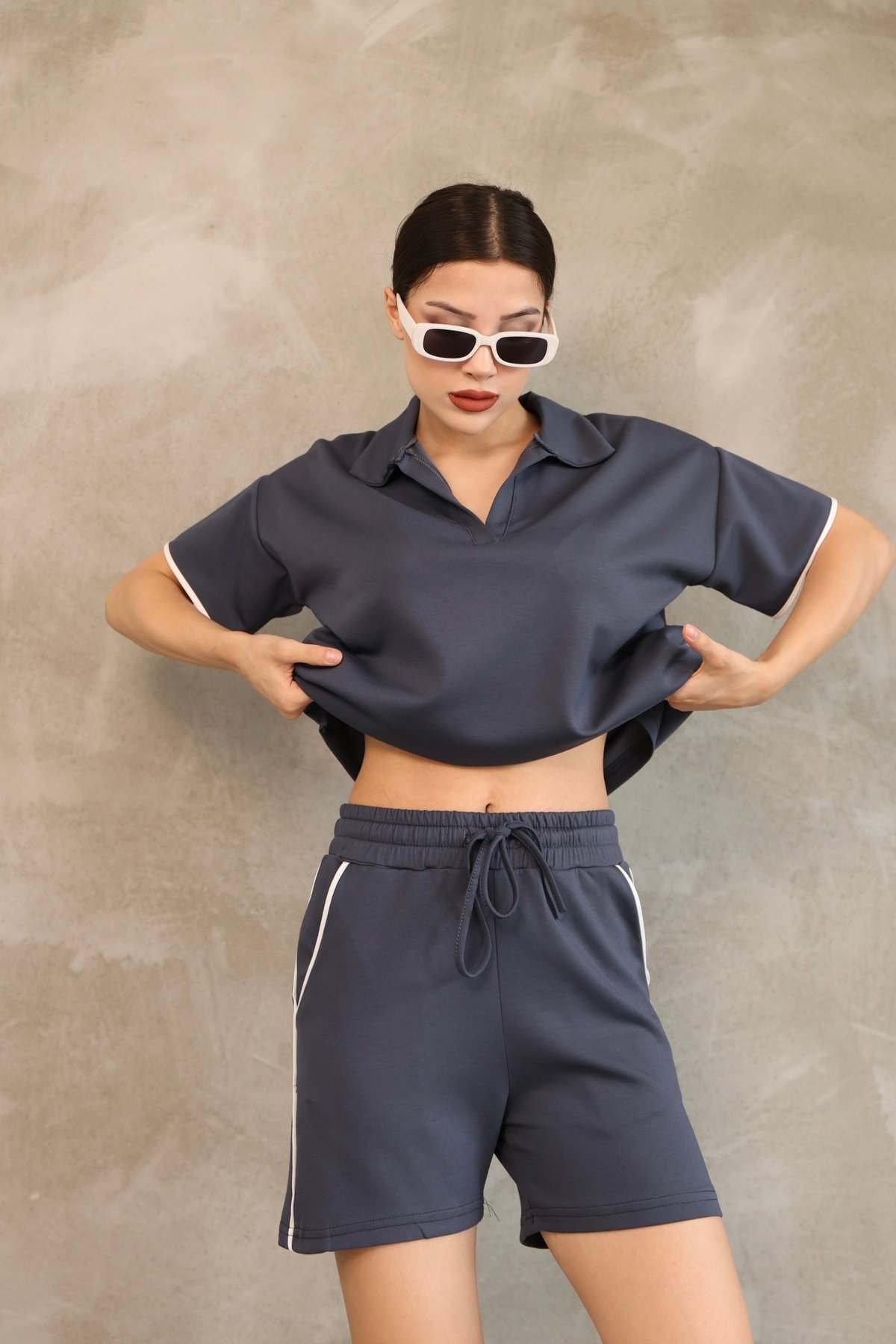 - Rahatlıkla kombinleyebileceğiniz biyeli polo yaka cepli şortlu takım, günlük kullanım için idealdir.; - %70 polyester, %25 pamuk ve %5 elastan içeren dokusuyla esnek yapısı sayesinde hareket özgürlüğü sunar.; - Çift cepli tasarımı ile pratik kullanım sağlar; küçük eşyalarınızı yanınızda taşımanız için kolaylık sunar.; - Astarsız yapısıyla hafif ve nefes alabilen bir yapıya sahiptir, yaz ayları için uygundur.; - Mono kapama detayı ile modern ve şık bir görünüm kazandırırken, yüksek bel kesimi vücut hatlarınıza uyum sağlar.; - Dokulu kumaşı ve çizgili deseniyle göz alıcı bir stil oluştururken, basic siluetiyle her gardıropta yerini alır.; - Relaxed kalıp sayesinde gün boyu rahat hareket edebilmenizi sağlar; standart kol boyu ile konforlu kullanım sunar.; - Kısa boy tasarımı yaz ayları için idealdir; sweatshirt-şort kombiniyle casual ortamlarda şıklığınızdan ödün vermezsiniz.; - Pamuk karışımlı kumaşı sayesinde yumuşak dokusuyla cildinize nazikçe dokunurken polyester karışımının dayanıklılığı uzun süreli kullanım vaat eder.