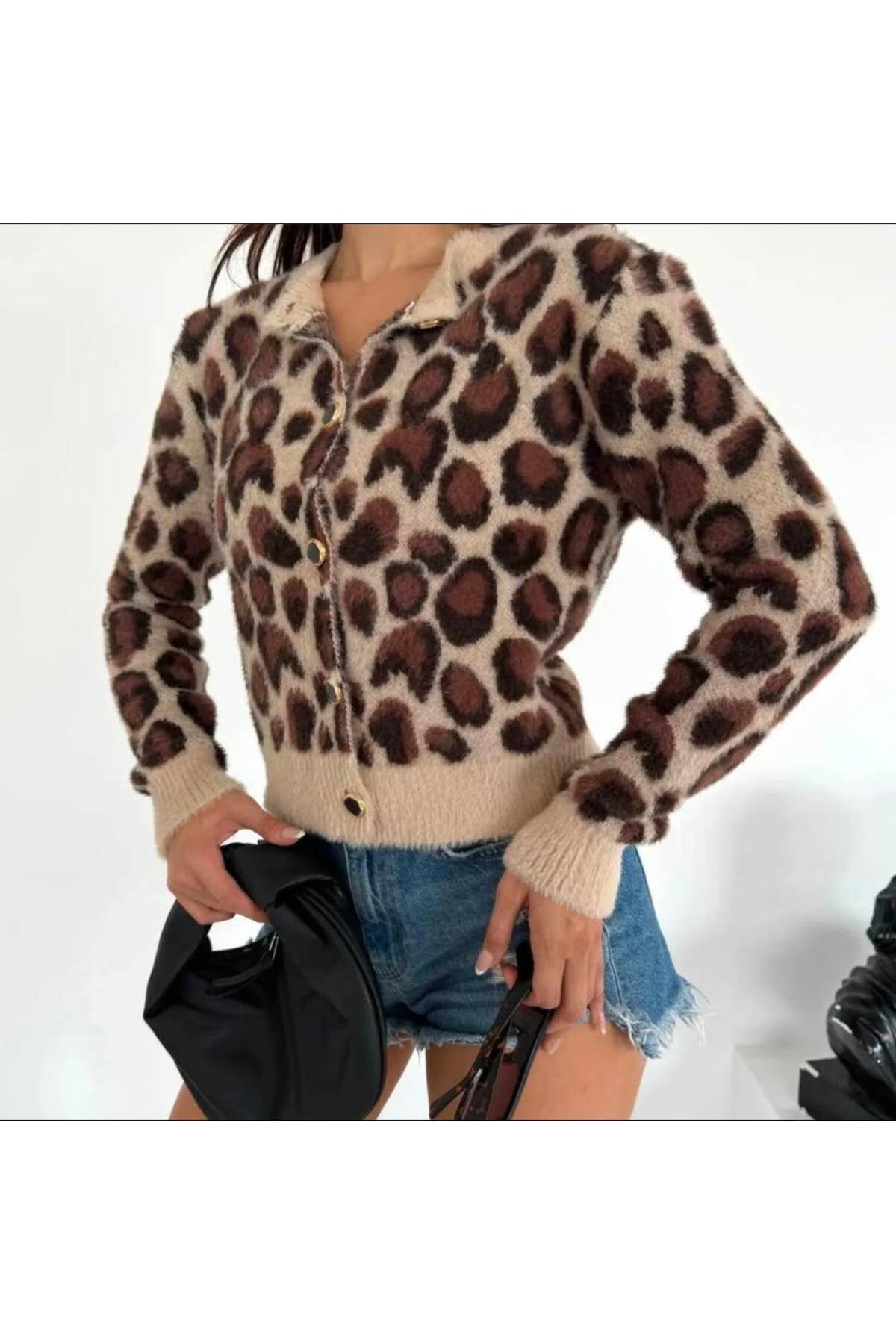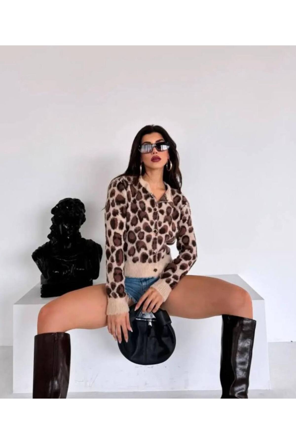Sportiness Leopar Desen Düğmeli Yumuşak Crop Hırka