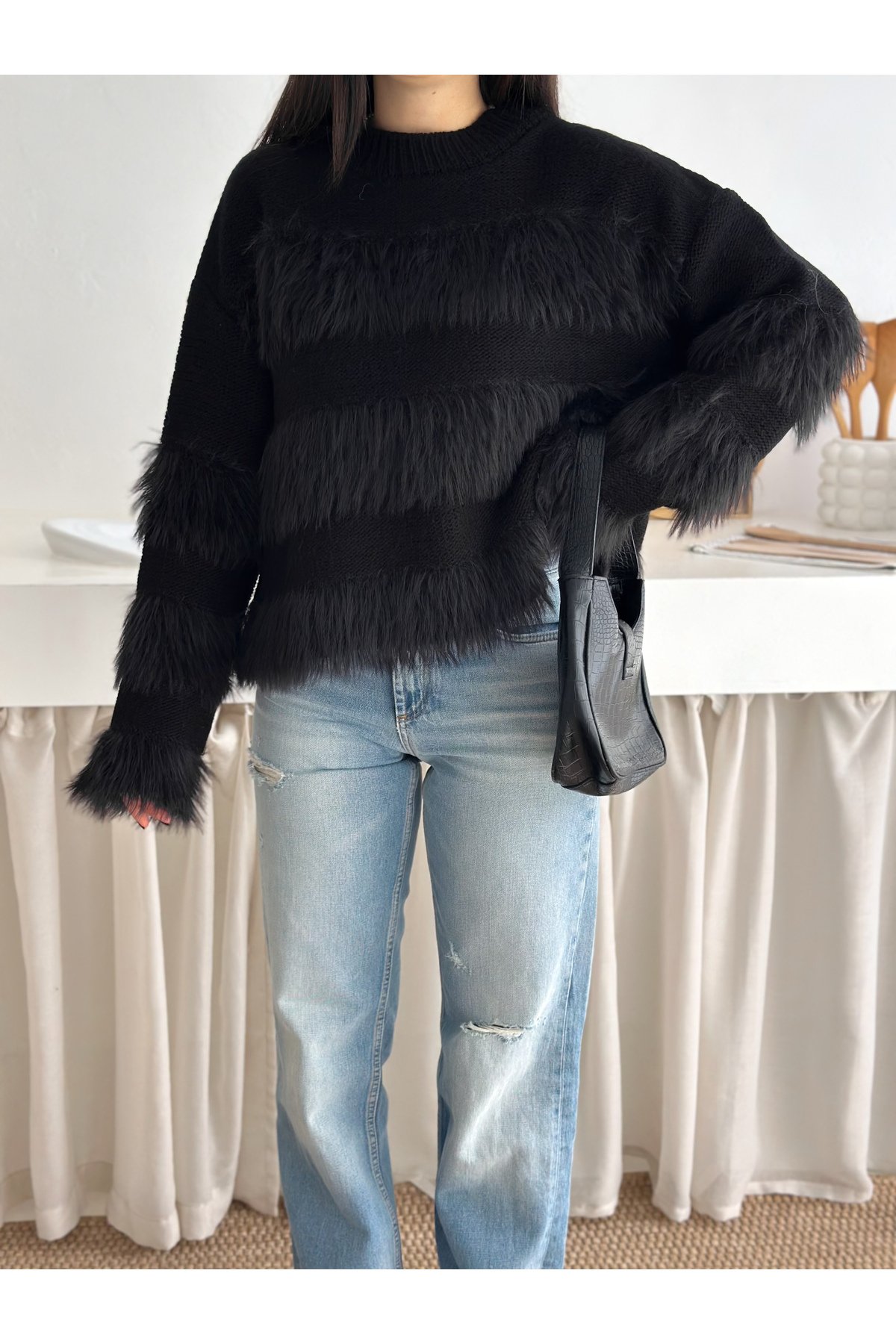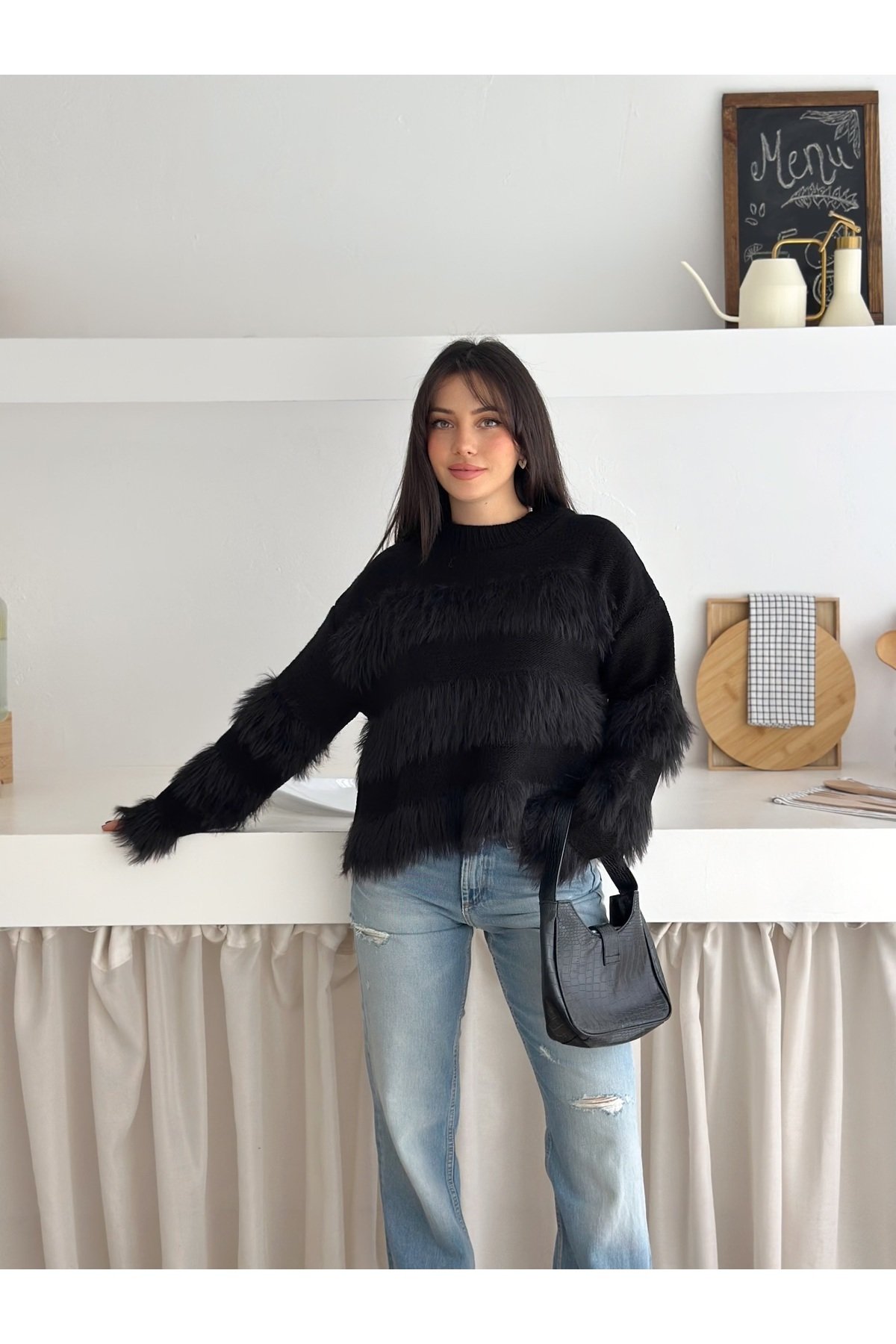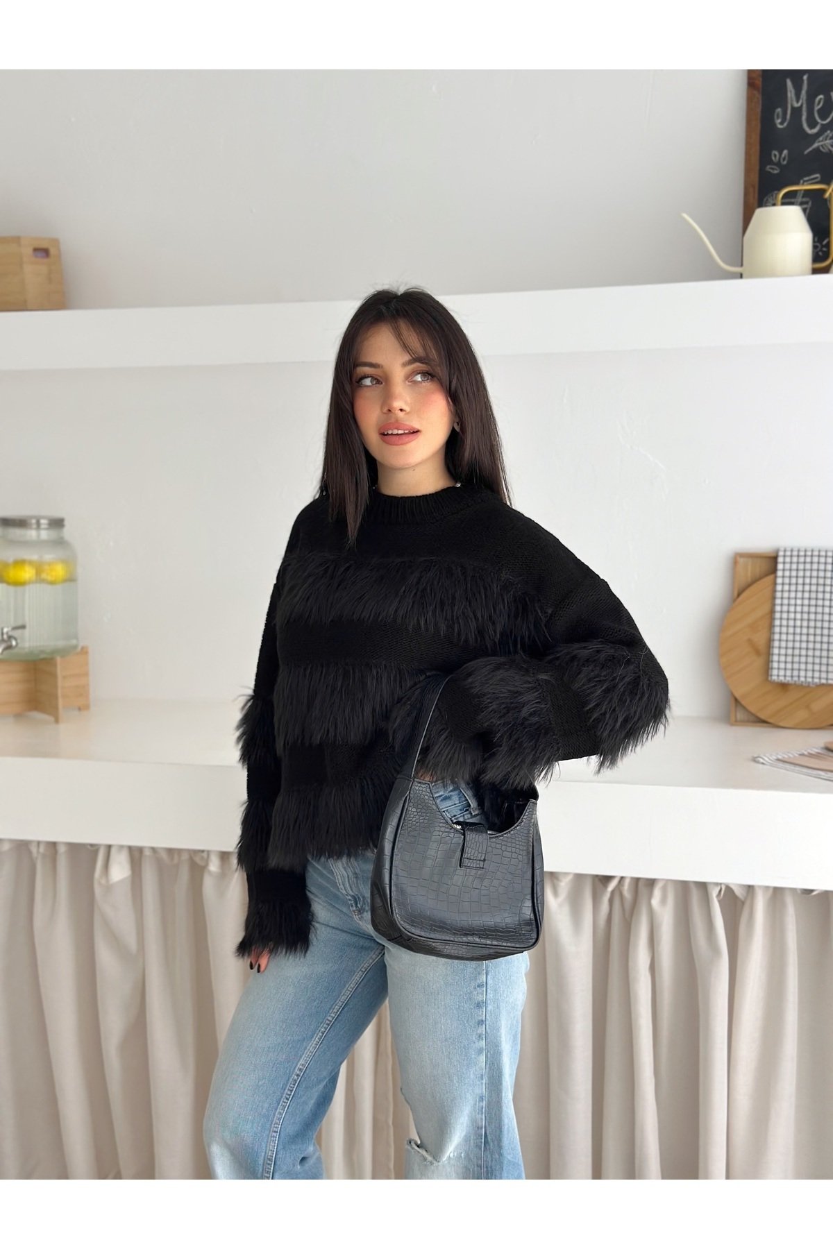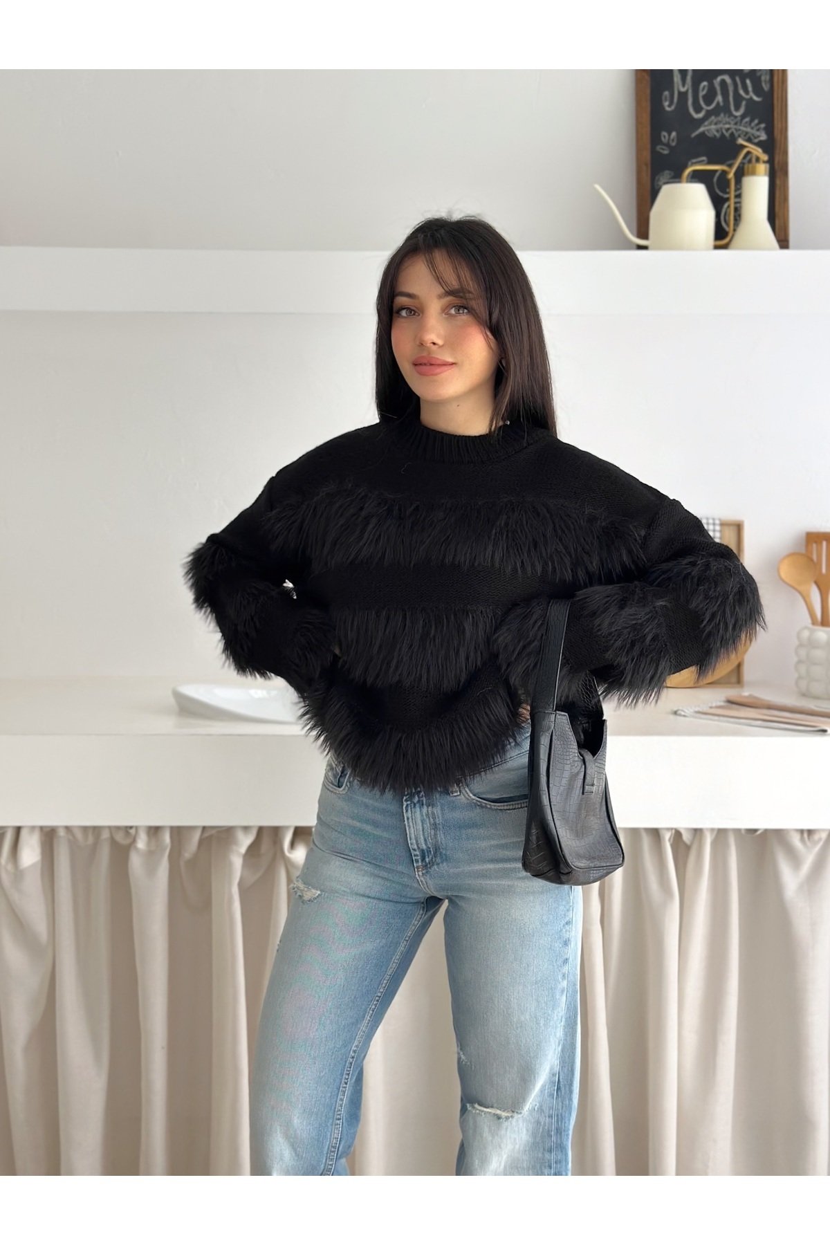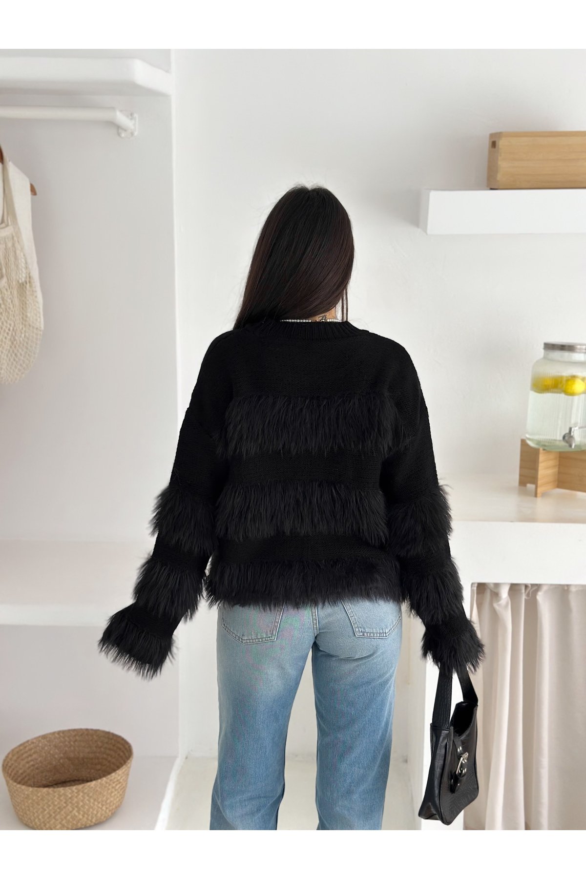 - Bisiklet yaka tasarımı ile modern ve şık bir görünüm sunar.; - Cepsiz yapısı sayesinde minimalist ve düzgün bir siluet sağlar.; - Triko materyali, yumuşak dokusuyla gün boyu konforlu bir kullanım imkanı tanır.; - Casual/günlük ortamlarda rahatlıkla tercih edilebilecek düz deseniyle sadelikten yana olanlar için idealdir.; - Tüylenme yapmayan özelliği ile uzun süreli kullanımda bile formunu korur.; - Orta kalınlıkta triko kumaşı, mevsim geçişlerinde ideal bir tercih olur.; - Regular kalıp ve uzun kol tasarımı, rahat hareket etme özgürlüğü sunar.; - Mono kapama şekliyle kolayca giyilip çıkartılabilir; pratiklik ve şıklığı bir arada sunar.; - Suni tüy detayları ile sofistike bir dokunuş eklerken, baskısız yüzeyiyle sade güzelliği ön plana çıkarır.; - Örgü dokuma tipi, dayanıklılığı arttırarak ürünün ömrünü uzatır.; -